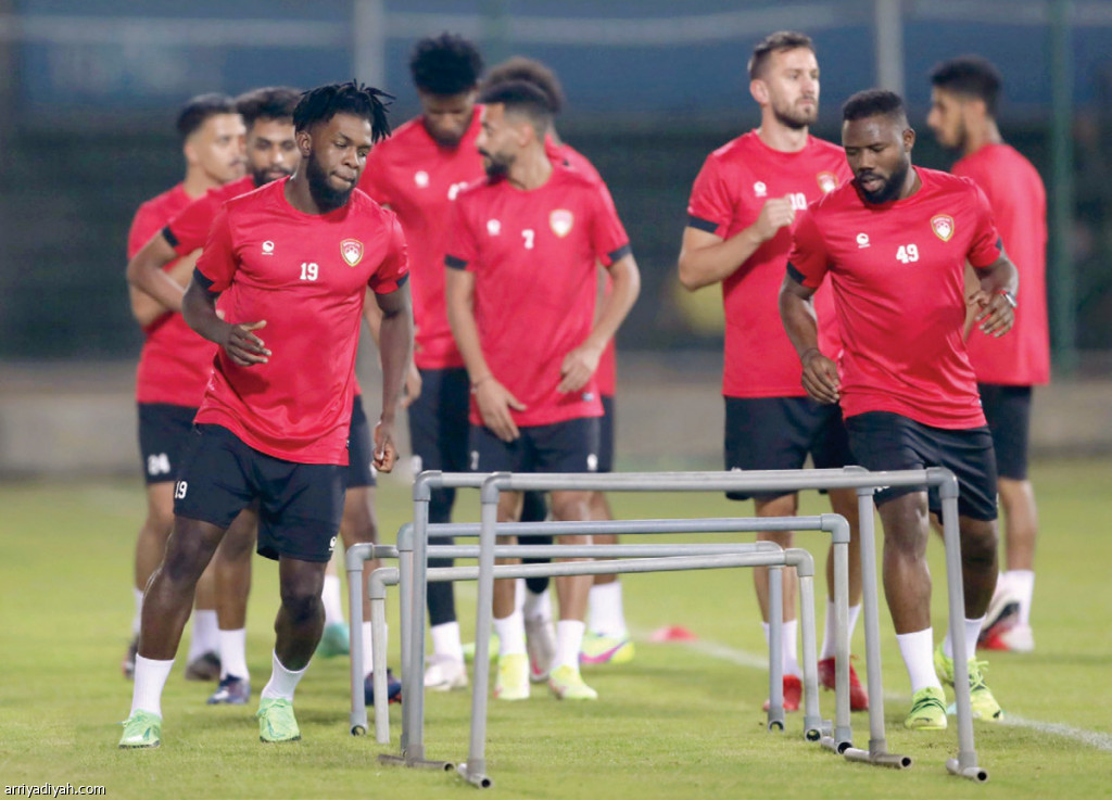 صورة التقطت أمس لعبد الله هوساوي، ظهير أيمن ضمك، وزميله عبد الله خطاب، المهاجم، أثناء التدريبات(المركز الإعلامي ـ ضمك)