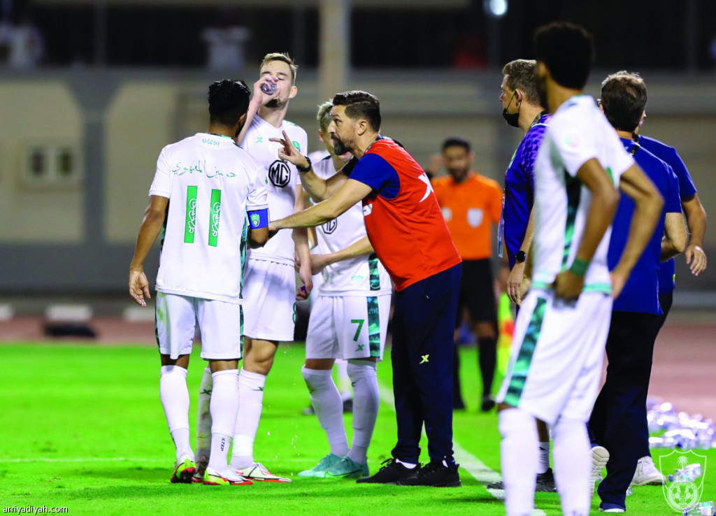صورة التقطت أمس للألباني هاسي، مدرب فريق الأهلي الأول لكرة القدم، يوجِّه لاعبيه خلال مواجهة الطائي أمس الأول (المركز الإعلامي ـ الأهلي)