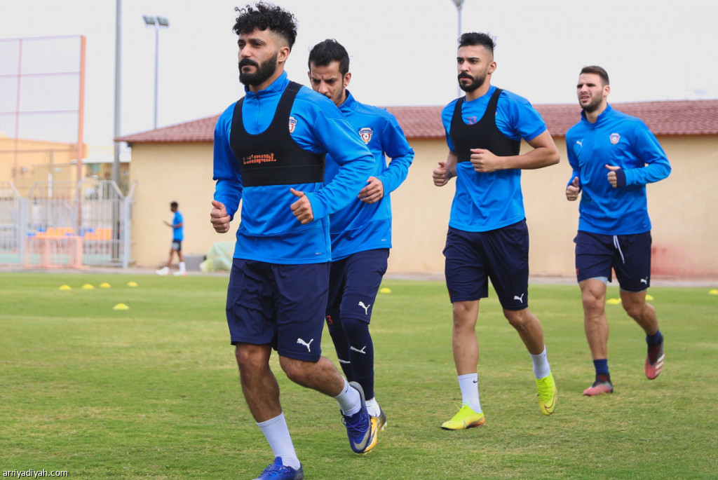صورة التقطت أمس للاعبي فريق الفيحاء الأول لكرة القدم يؤدون تدريبات الإحماء قبل انطلاق المناورة (المركز الإعلامي ـ الفيحاء)