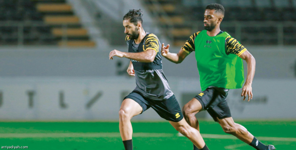 صورة التقطت أمس الأول لأحمد باحسين لاعب فريق الاتحاد ينطلق بالكرة أثناء التدريبات، وسط مطاردة من عوض الناشري زميله (المركز الإعلامي ـ الاتحاد)