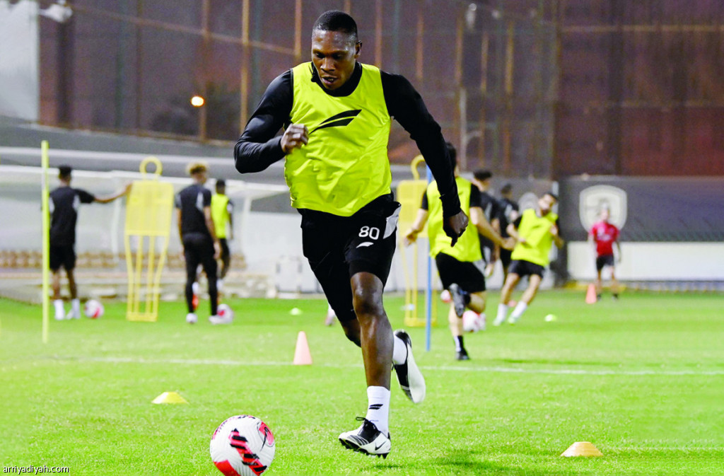 صورة التقطت أمس للكاميروني جون ماري، مهاجم فريق الشباب الأول لكرة القدم، يتقدم بالكرة خلال حصة تدريبية للفريق على رديف ملعب النادي (المركز الإعلامي - الشباب)