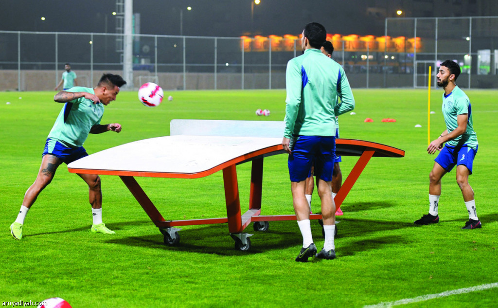 صورة التقطت أمس للبيروفي كريستيان كويفا، لاعب فريق الفتح الأول لكرة القدم، يلعب الكرة برأسه خلال تحدي كرة الطاولة مع أيمن الخليف (المركز الإعلامي ـ الفتح)
