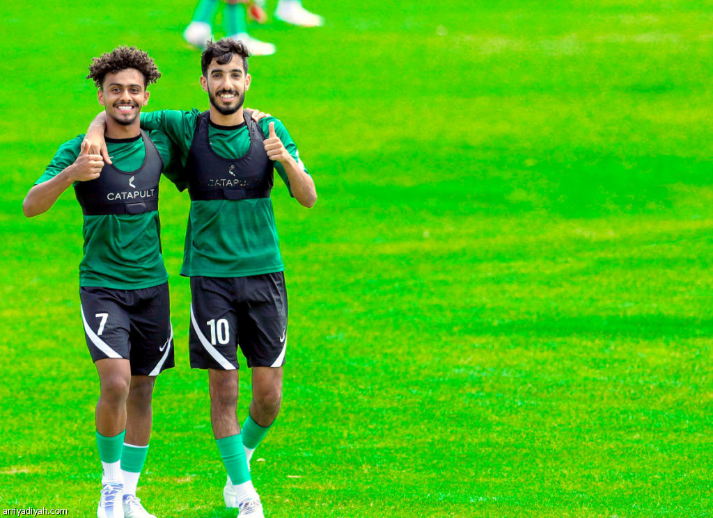 صورة التقطت أمس لمحمد المري وعبد العزيز العليوة، لاعبَي وسط المنتخب السعودي لكرة القدم تحت 20 عامًا، خلال التدريب الأخير قبل مواجهة غانا (المركز الإعلامي ـ اتحاد القدم)