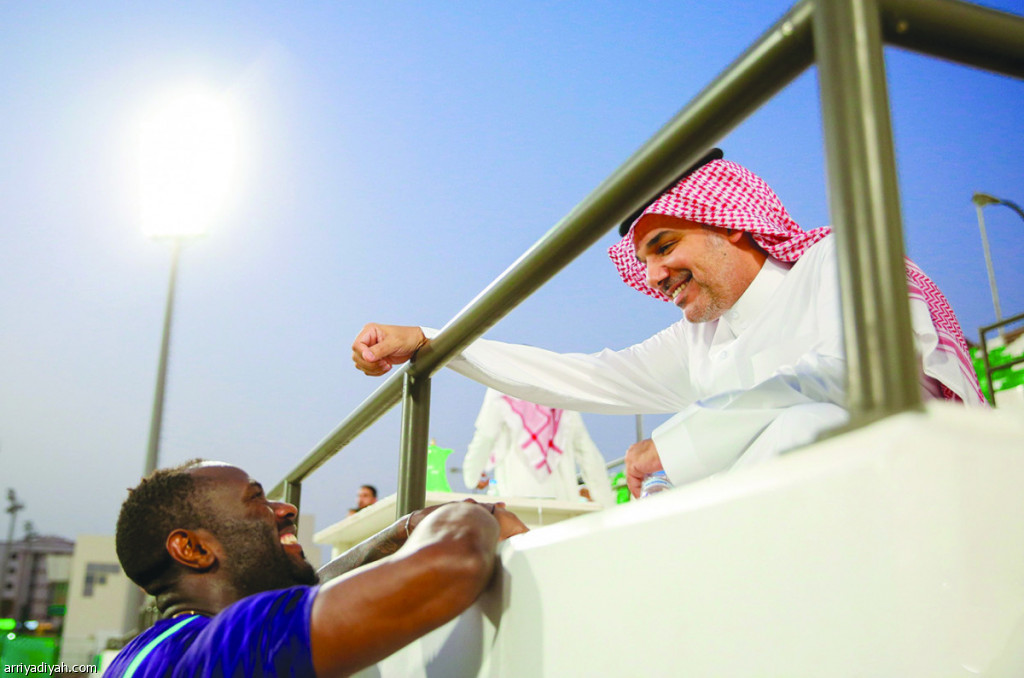 صورة التقطت أمس الأول لماجد النفيعي، رئيس النادي الأهلي، يتحدث إلى فرانك كوم لاعب الفريق قبل الحصة التدريبية (المركز الإعلامي ـ الأهلي)