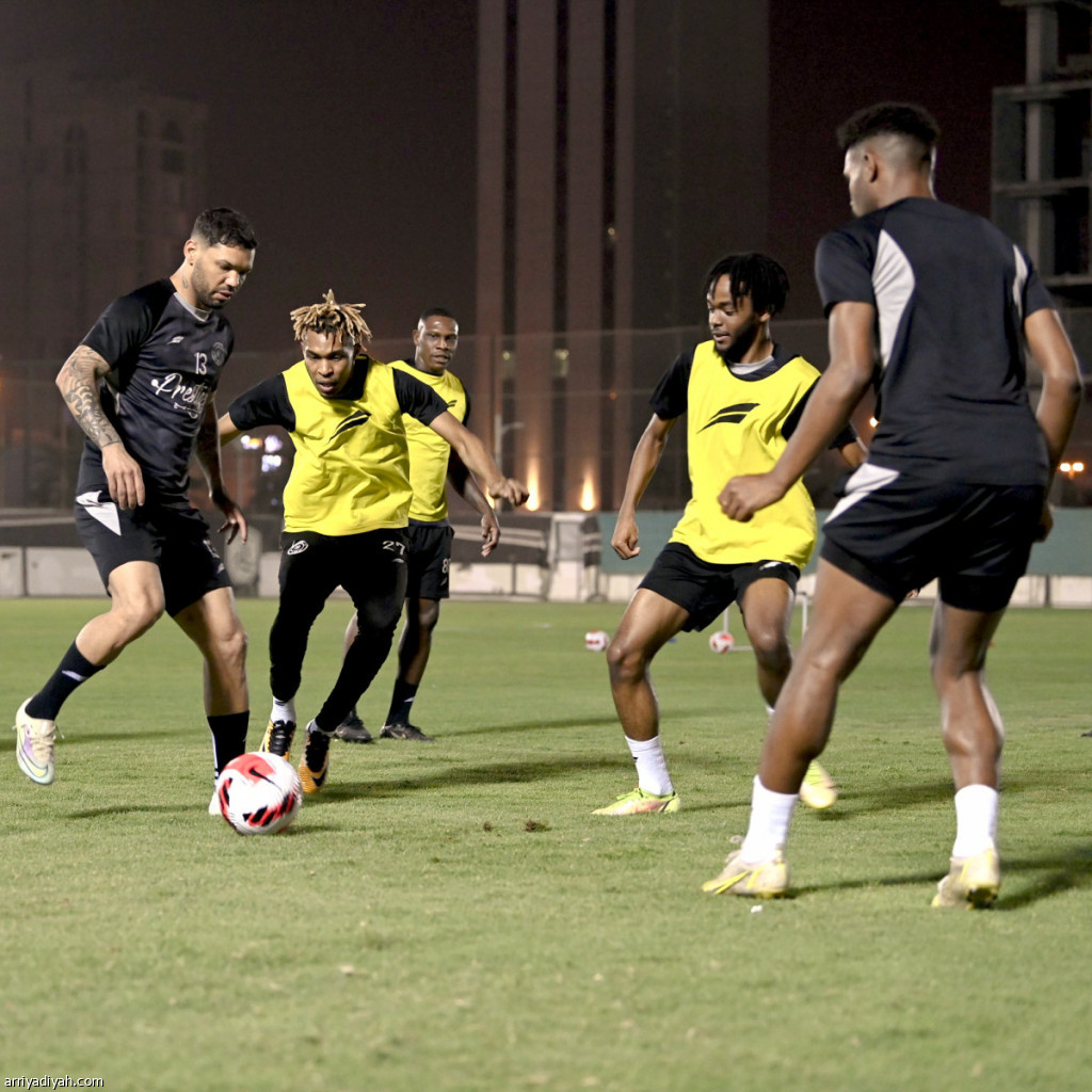 صورة التقطت أمس للبرازيلي كارلوس جونيور، مهاجم الشباب، يمرر الكرة وسط متابعة من فواز الصقور خلال الحصة التدريبية للفريق (المركز الإعلامي ـ الشباب)