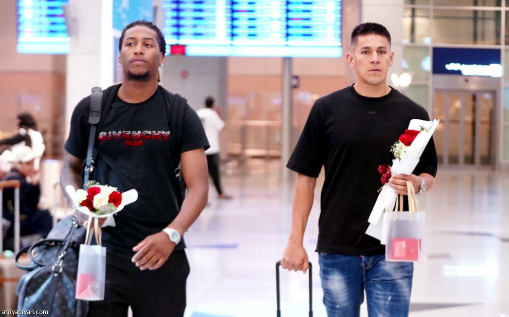 صورة التقطت أمس للكوستاريكي أوسكار دوراتي، مدافع الوحدة الجديد، واللوكسمبورجي جيرسون رودريجيز، لاعب الوسط، يحملان باقتي ورد فور وصولهما إلى المطار في جدة (المركز الإعلامي ـ الوحدة)