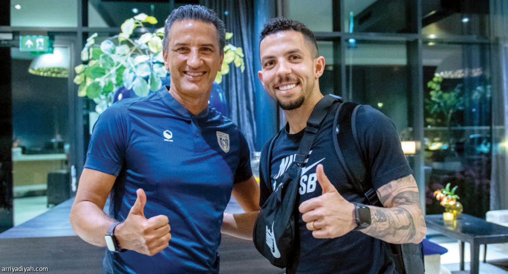 صورة التقطت أمس للبرازيلي فلافيو داسيلفا، لاعب التعاون، ومواطنه بريكليس شاموسكا، مدرب الفريق، أثناء وصول الأول إلى مقر المعسكر في أمستردام (المركز الإعلامي ـ التعاون)
