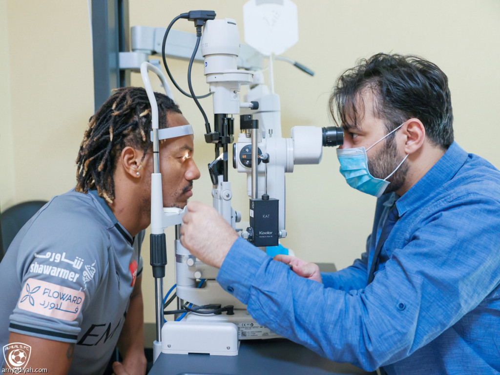 صورة التقطت أمس للبيروفي أندريه كاريلو، لاعب فريق الهلال الأول لكرة القدم، أثناء إجراء كشف العيون خلال الفحوصات الطبية الموسمية (المركز الإعلامي ـ الهلال)