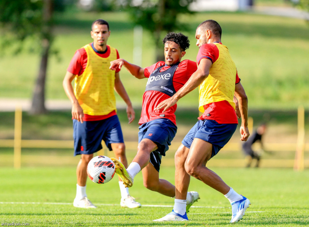 صورة التقطت أمس للجزائري هلال سوداني والهولندي آدم ماهر لاعبي فريق ضمك يحاصران عبد الإله البريه أثناء التدريبات (المركز الإعلامي ـ ضمك)