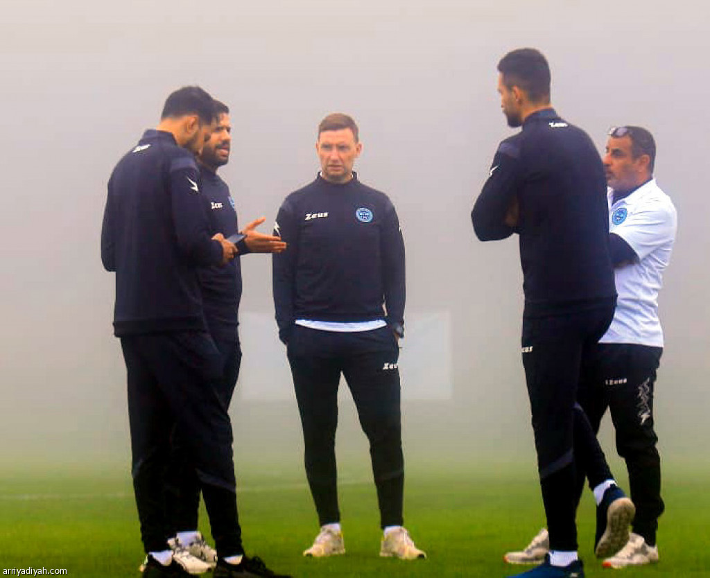 صورة التقطت أمس للكرواتي ألين هورفات، مدرب الباطن، وسط عدد من معاونيه على أرضية الملعب ووسط الضباب قبل إلغاء مباراة الخور (المركز الإعلامي- الباطن)