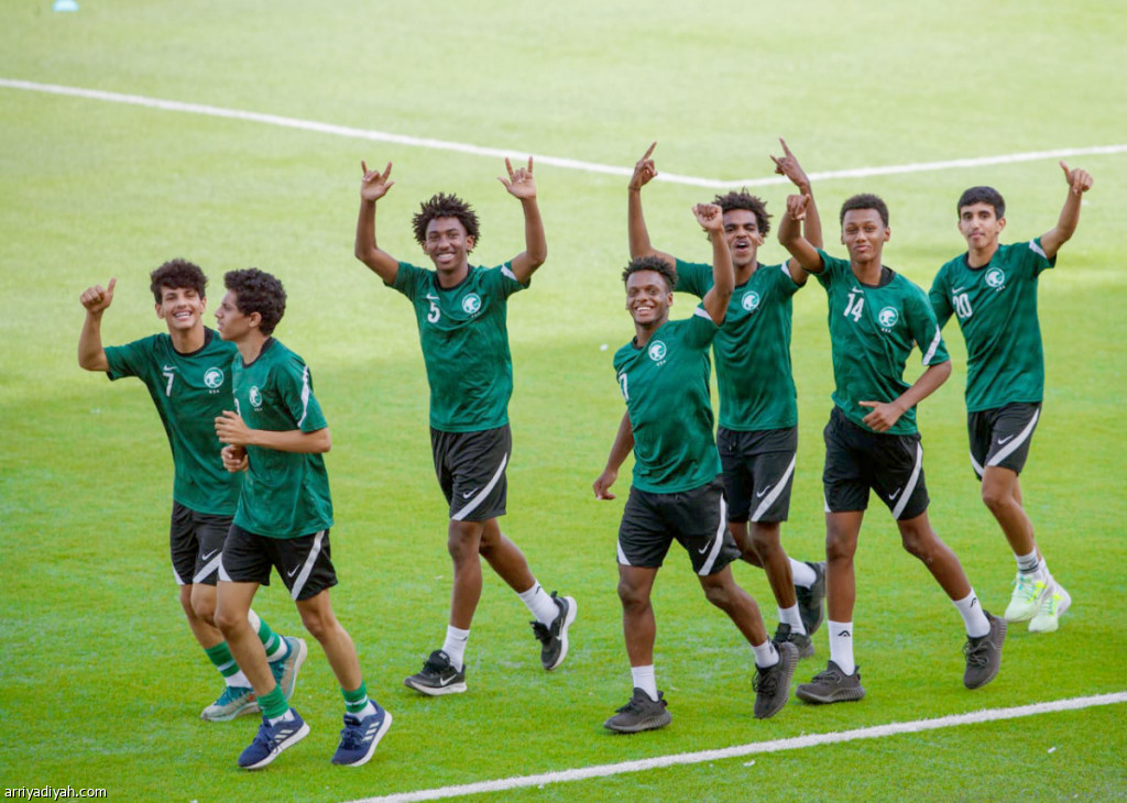 صورة التقطت أمس للاعبي المنتخب السعودي لكرة القدم تحت 17 عامًا خلال أداء تمارين الإحماء في التدريب الأخير الذي يسبق مواجهة منتخب لبنان (المركز الإعلامي ـ اتحاد القدم)