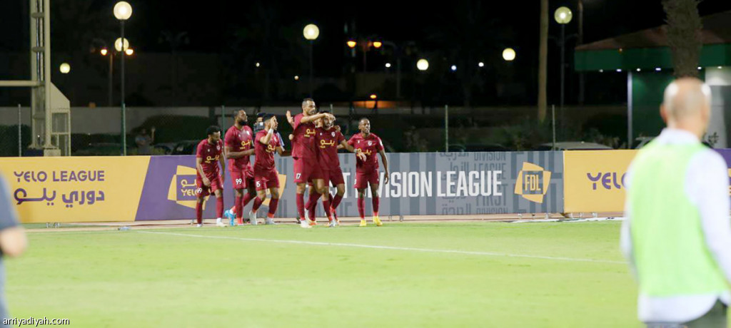 صورة التقطت أمس لإبراهيم الطلحي لاعب جدة يحتفل برفقة زملائه بعد تسجيله هدفًا في مرمى الشعلة(المركز الإعلامي - دوري يلو)