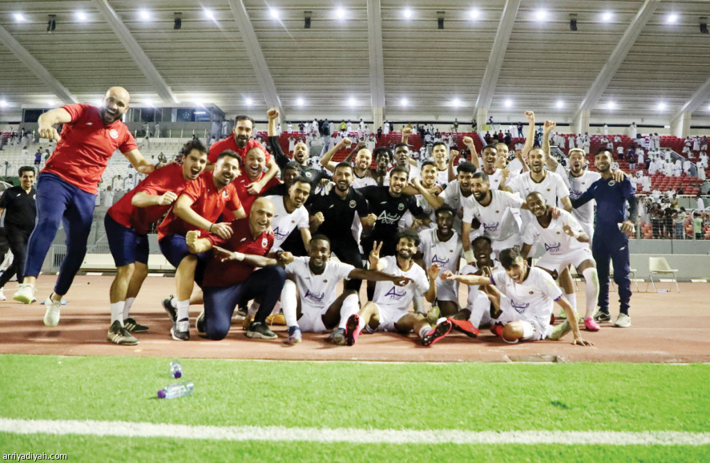 صورة التقطت أمس للاعبي فريق الجبلين وأعضاء الجهاز الفني يحتفلون بالفوز على الأخدود (المركز الإعلامي ـ دوري يلو)
