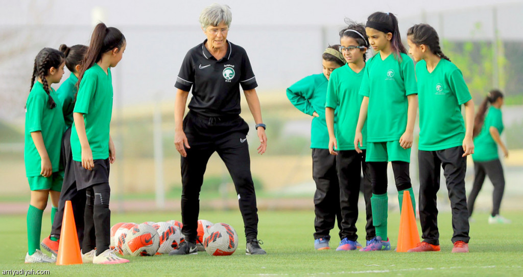 صورة التقطت أمس للألمانية مونيكا ستاب، مدربة المنتخب السعودي للسيدات، خلال إشرافها على مراكز التدريب الإقليمية للناشئات (المركز الإعلامي ـ إدارة الكرة النسائية)