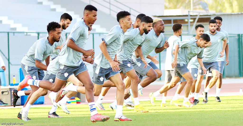 صورة التقطت أمس للاعبي الطائي يركضون في بداية التدريبات استعدادًا للقاء الرائد اليوم (المركز الإعلامي ـ الطائي)
