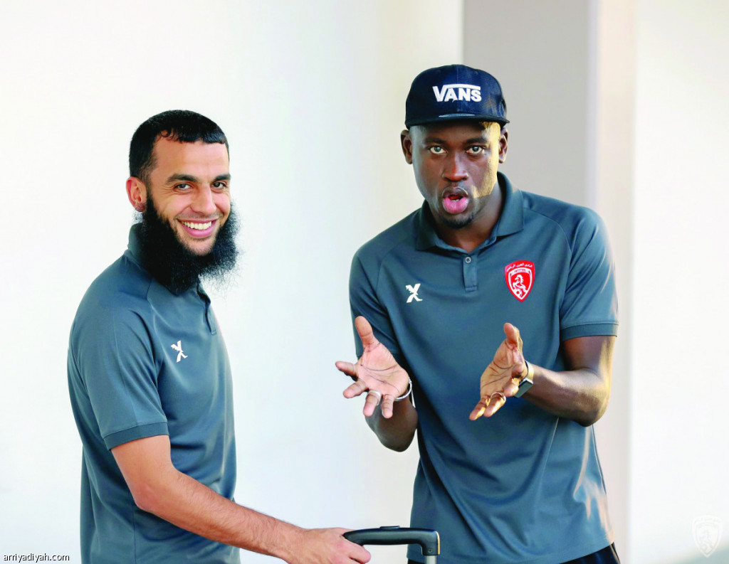 صورة التقطت أمس للسنغالي فيوكس أبلاي، مهاجم العربي، وزميله المغربي سفيان أحناش، لاعب الوسط، لدى مغادرة بعثة الفريق مطار الجوف بعد الوصول من بريدة (المركز الإعلامي ـ العربي)