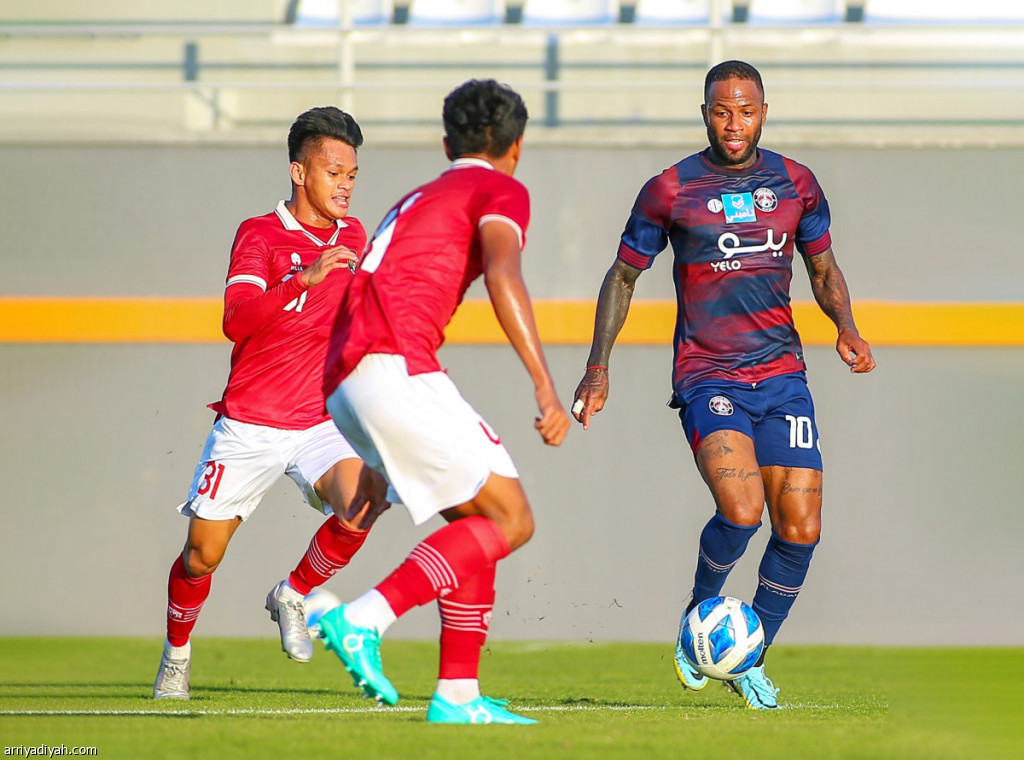 صورة التقطت أمس للكولومبي رينالدو لينس، لاعب فريق العدالة الأول لكرة القدم، يحاول تخطي لاعبَين من المنتخب الإندونيسي خلال المباراة (المركز الإعلامي ـ العدالة)