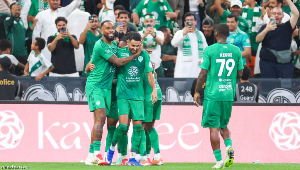 الجزائري رياض محرز، جناح الأهلي، يحتفل مع زملائه بعد التسجيل أمام الاتحاد، الجمعة، في ديربي الجولة الـ 25 من دوري روشن السعودي تصوير: عدنان مهدلي